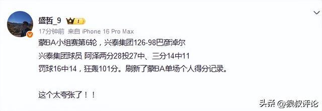 博主罗掌柜体育发文点评:超越张伯伦!蒙BA球员单场狂轰101分,两分28投27中,三分14中11。